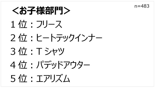ユニクロを着用すると回答した方に、秋冬のアウトドアシーンにおいて着用しているユニクロ商品を教えていただきました。大人部門では、1位のヒートテックインナー、4位と5位にはヒートテックパンツやタイツなど、ヒートテック関連アイテムが多数ランクイン。フリースやウルトラライトダウンジャケットなど、メインアイテムも上位に入っていました。お子様部門では、体温調整に最適なフリースが1位に。洗えるパデッドアウターも汚れが気になるお子様のアウターとして人気!