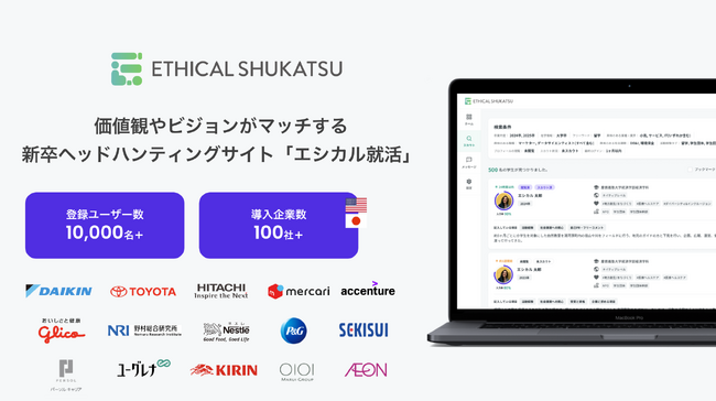 同社が展開する、企業理念や価値観が合うハイクラス学生と出会えるスカウト型採用プラットフォーム『ETHICAL SHUKATSU』は2021年5月のリリース後、導入企業は日米100社以上、登録ユーザー数は約10,000名を突破。