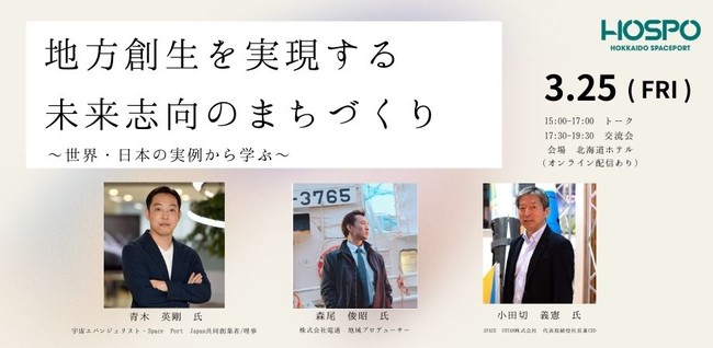 SPACE COTAN株式会社(本社:北海道広尾郡大樹町、代表取締役社長兼CEO 小田切義憲)と大樹町(本庁:北海道広尾郡大樹町、町長 酒森正人)は、 2022年3月25日(金)に帯広市内の北海道ホテルにて「地方創生を実現する未来志向のまちづくり」と題したトークイベントを開催致します。アジア初の民間にひらかれた商業宇宙港「北海道スペースポート(HOSPO)」を核とした宇宙版シリコンバレーの形成は、宇宙産業による地方創生の取り組みとなります。イベント当日は、世界のスペースポートの現状や宇宙×地方創生の取り組みや、未来技術等により外貨を稼ぐ仕組みづくりや関係人口・交流人口の創出等のまちづくりの新潮流についてお話いただきます。「北海道スペースポート(HOSPO)」が本格稼働して1年目の活動やトピックスのご報告もさせていただきます。ご多忙の折、大変恐縮ではございますが、ご参加のほどよろしくお願い致します。