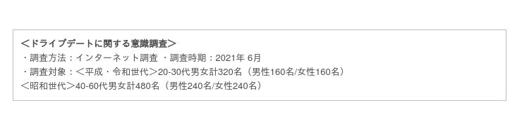 本WEB 動画は、全国の20-60代の男女400名、合計800名を対象に、インターネットで実施した「ドライブデートに関する意識調査」の結果を使用しました。