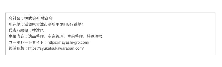株式会社林商会が運営する「終活瓦版」では、終活に関する内容を中心に、遺品整理士・特殊清掃士の経験を基にしたさまざまな情報を発信しています。