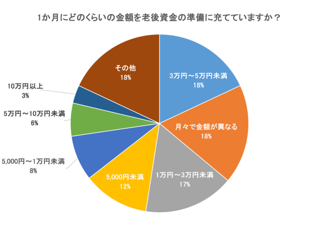 「1か月にどのくらいの金額を老後資金の準備に充てていますか?」という質問では、「3万円~5万円未満」と「月々で金額が異なる」が18%で並び、「1万円~3万未満」17%、「5,000円未満」12%が続く結果になりました。