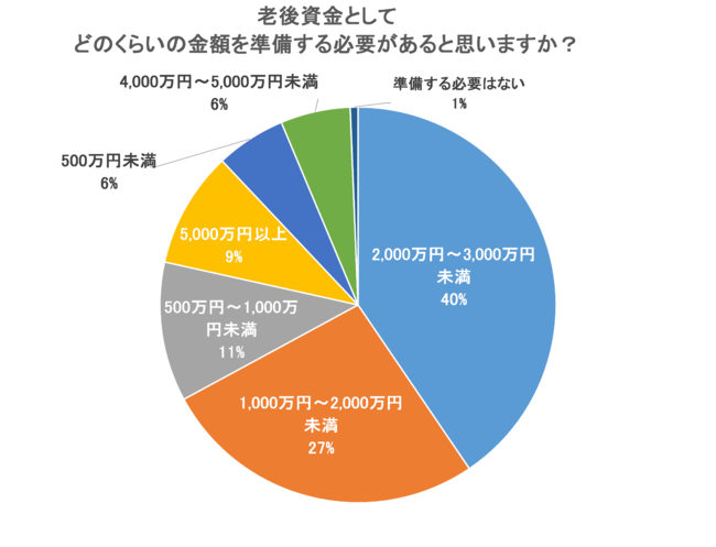 「老後資金としてどのくらいの金額を準備する必要があると思いますか?」という質問では、40%が「2,000万円~3,000万未満」と回答し、「1,000万円~2,000万未満」27%、「500万円~1,000万円未満」11%が続く結果になりました。