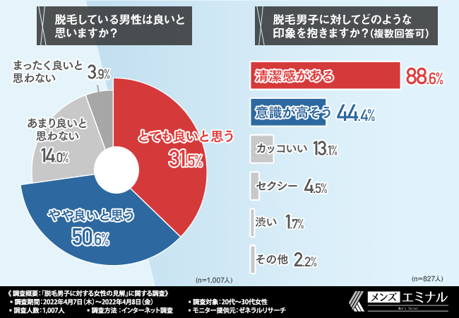 そこで今回、メンズ医療脱毛クリニック『メンズエミナル』(https://mens-eminal.jp/lp/?refmedia=31073)は、20代~30代の女性を対象に、「脱毛男子に対する女性の見解」に関する調査を実施しました。