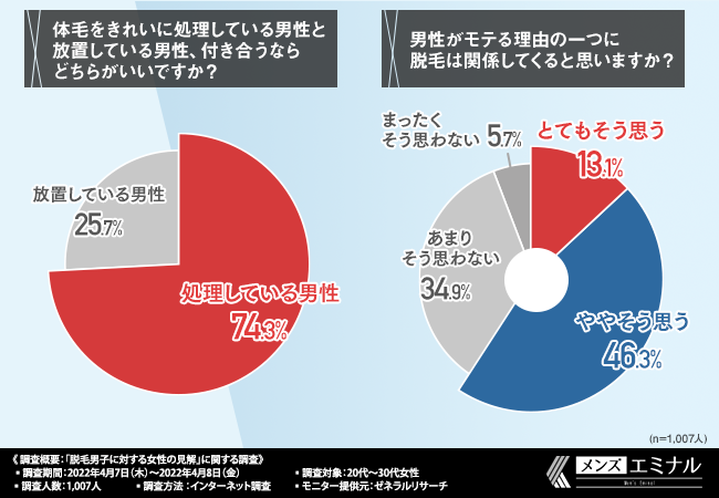 今回の調査で、7割以上の女性が「付き合うなら体毛の処理をしている男性の方が良い」、約6割の方が「男性がモテる理由の一つに脱毛は関係してくる」と考えていることがわかりました。