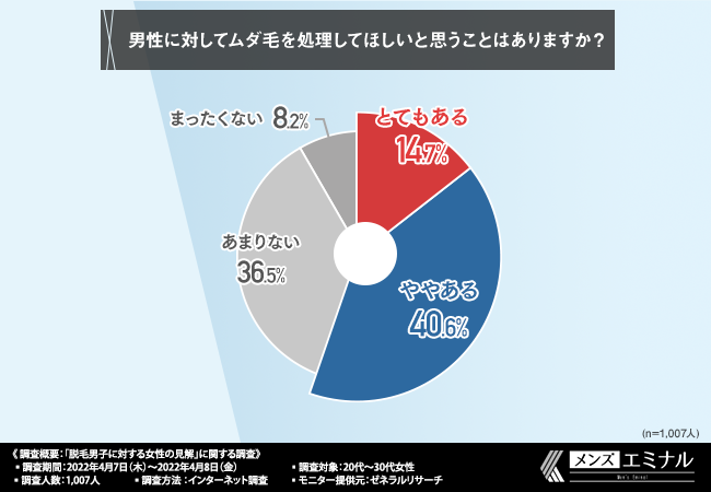 「男性に対してムダ毛を処理してほしいと思うことはありますか?」と質問したところ、半数以上の方が『とてもある(14.7%)』『ややある(40.6%)』と回答しました。