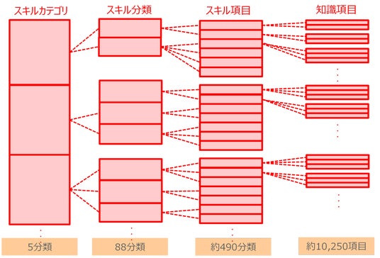 それぞれのスキル項目に対して“知識項目”が紐づいており、さらにテクノロジー関連スキルに対しては、知識項目に加え、“技術・製品情報”も付加しました。