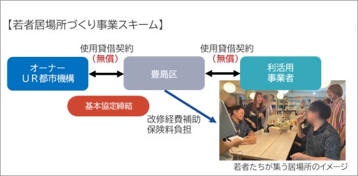 区がUR都市機構の所有する防災まちづくり用地及び建物を無償貸借し、それを若者支援団体に無償で転貸借をし運営してもらい、若者の居場所を創出する事業。