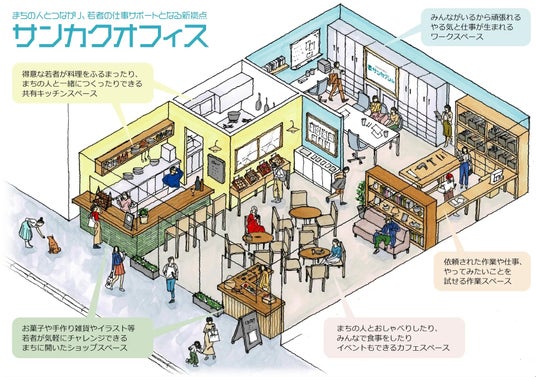 ※今回、無償でお借りする物件はサンカクオフィスの第1号となる拠点。サンカクオフィスの機能の内、飲食業にテーマを絞って、若者と一緒に運営する飲食事業を展開する予定です。