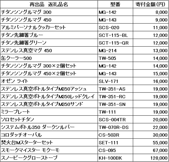 昨年は、「チタンシングルマグ」シリーズの11月18日(木)の先行出品を皮切りに、以後11月25日、12月10、15、27日、1月25日の6回にわたり新規の返礼品を織り交ぜながら人気返礼品の追加出品を行いましたが、即日在庫切れや申込多数で欠品する商品が多くなりました。