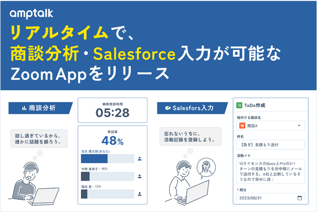 amptalk株式会社(本社:東京都渋谷区、代表取締役社長:猪瀬 竜馬、以下 amptalk)は、営業が強くなる商談分析ツール「アンプトーク」において、オンライン商談のリアルタイム分析とSalesforceの入力ができるZoom Appをリリース。