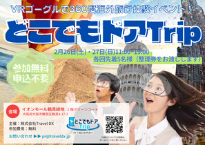 株式会社メタリアル(東証マザーズ上場 証券コード:6182)の子会社で、 VR旅行体験の「どこでもドアTrip(※1)」を運営する株式会社Travel DX(本社:東京都千代田区 代表取締役:五石 順一)は、2月26日(土)、2月27日(日)の2日間、VRゴーグルで海外旅行体験ができる『どこでもドアTrip体験イベント』を開催いたします。