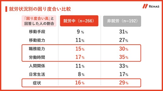- 全体を比較すると就労中の方は、職務能力・人間関係・障害の症状で困り度合いが高いことが分かる。移動や労働時間は納得のいく職場に就けている方が多いと考えられる。