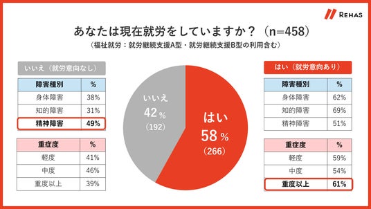回答者458人中、266人(58%)が現在就労中、192人(42%)が現在非就労と回答。