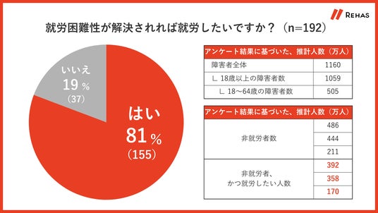 非就労者192名中、155名(81%)が「就労課題が解決されれば就労したい」と回答しました。この割合を18歳以上の全国の障がい者に適用すると、約360万人が就労意欲を持つと推定されます。