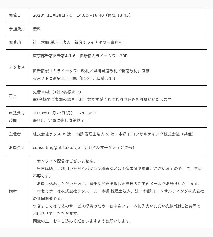 辻・本郷 ITコンサルティング株式会社(本社:東京都渋谷区、代表取締役社長:黒仁田 健)は、株式会社ラクス(本社:東京都渋谷区、代表取締役 社長:中村 崇則)と共催で、2023年11月28日(火)に無料セミナー「実際に触れて体感するチャンス!「楽楽精算」「楽楽明細」体験セミナー」を共催します。