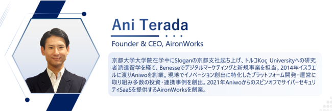 京都大学大学院在学中にSloganの京都支社起ち上げ、トルコKoç Universityへの研究者派遣留学を経て、Benesseでデジタルマーケティングと新規事業を担当。2014年イスラエルに渡りAniwoを創業。現地でイノベーション創出に特化したプラットフォーム開発・運営に取り組み多数の投資・連携事例を創出。2021年AniwoからのスピンオフでサイバーセキュリティSaaSを提供するAironWorksを創業。