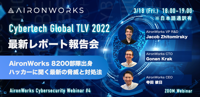 AironWorks株式会社 (本社:東京都港区、代表取締役:寺田 彼日、以下「AironWorks」) は、『AironWorks Cybersecurity Webinar #4』を3月18日 (金)に開催します。本ウェビナーでは、イスラエル最大のセキュリティカンファレンス「Cybertech Global TLV 2022」の最新レポートと2022年も大きな被害を出し続けるランサムウェア、標的型攻撃、サプライチェーン攻撃の実態と対処法についてAironWorks CEO, CTO, VP R&Dと共に議論します。