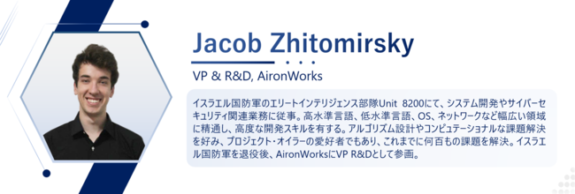 イスラエル国防軍のエリートインテリジェンス部隊Unit 8200にて、システム開発やサイバーセキュリティ関連業務に従事。高水準言語、低水準言語、OS、ネットワークなど幅広い領域に精通し、高度な開発スキルを有する。アルゴリズム設計やコンピュテーショナルな課題解決を好み、プロジェクト・オイラーの愛好者でもあり、これまでに何百もの課題を解決。イスラエル国防軍を退役後、AironWorksにVP R&Dとして参画。