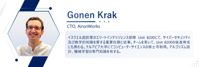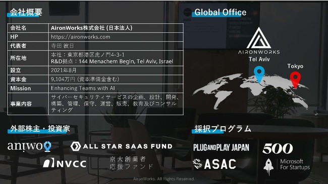 AironWorksは "Enhancing Teams with AI" を企業ミッションに、イスラエル国防軍 Unit 8200出身エンジニアが開発する最先端技術を駆使したサイバーセキュリティソリューションを提供しています。