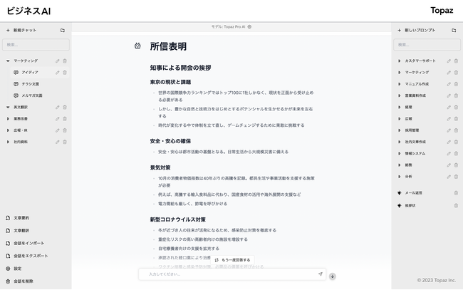 「Llama 2」搭載「ビジネスAI」利用画面 (画像は「Topaz Pro AI」を使用。引用: 令和4年12月1日東京都議会)