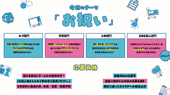 今回のコンテストのテーマは「お祝い」です。配信者として活動する中で日々生まれる、様々なお祝いすべき場面を彩る、いつもと違うワクワクの中で配信が行えるような作品を募集しております。