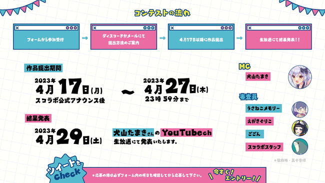 作品提出期間は2023年4月17日(公式アナウンス後)~4月27日23時59分、4月29日に「Tamaki Ch. 犬山たまき / 佃煮のりお」内でクリエイターによる座談会配信の後、スココンの受賞者発表が行われる予定です。