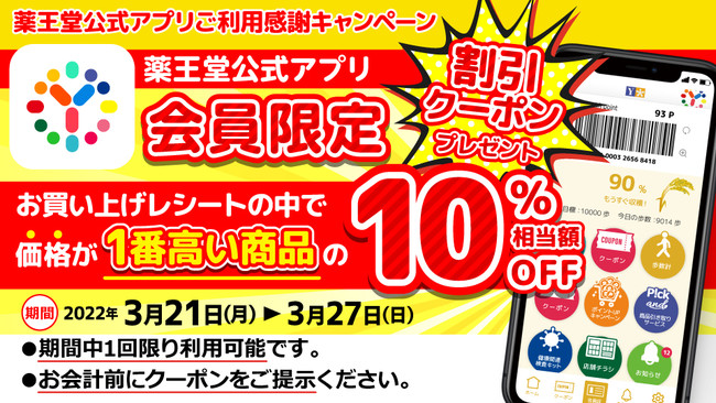 ご利用方法 :薬王堂公式アプリへ通知されるクーポンをお会計時に提示。お会計より割引(1回のみ)