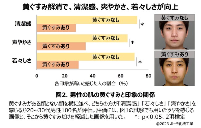 さらに、ツヤを感じる顔において、黄ぐすみの度合いを変更した2枚の画像を用意し3つの印象の違いを評価すると、黄ぐすみのない顔は清潔感、爽やかさ、若々しさの印象が全て高いことが確認されました(図2)。