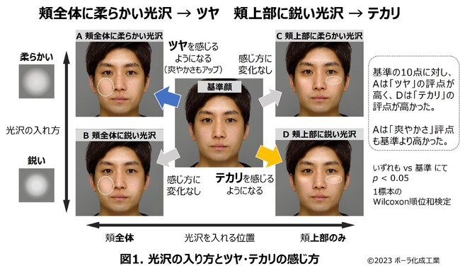 基準顔に対して、頬全体に柔らかい光沢がある顔(A)はツヤを感じやすく、頬上部に鋭い光がある顔(D)はテカリを感じやすくなること(図1)が明らかとなりました。