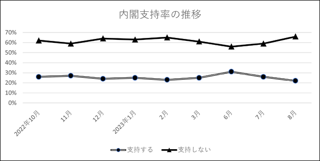 岸田内閣の支持率は22%と7月2日の前回調査から4ポイント下落し、昨年10月に調査を開始して以降、過去最低となった。不支持率も前回比7ポイント増の66%と過去最悪を記録した。岸田内閣を支持しないと答えた人にその理由を尋ねたところ、「政策が期待できないから」が57%(回答者全体の37%)を占め、「岸田首相が信用できないから」が28%(同19%)だった。「政策が期待できないから」は前回調査の57%(同34%)から横ばいだった一方、「岸田首相が信用できないから」は前回の25%(同15%)から微増しており、岸田首相に対する評価は厳しい。