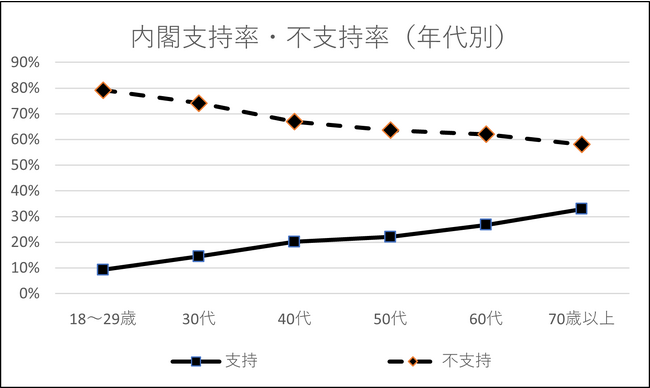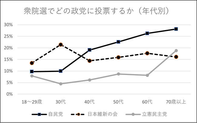 特徴的なのが年代別の回答だ。衆院選の投票先で自民と回答した人の割合を年代別にみると18~29歳10%▽30代10%▽40代19%▽50代23%▽60代26%▽70歳以上28%--という「若低老高」型になる。これに対し維新は18~29歳13%▽30代21%▽40代14%▽50代16%▽60代18%▽70歳以上16%--と幅広い世代に支持を広げ、30代以下では自民を上回っている。岸田内閣の支持率も「若低老高」の傾向にあり、内閣支持率の低迷が若年層の自民離れにつながっている可能性も指摘できそうだ。