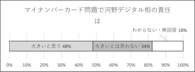 内閣支持率が急落した要因の一つがマイナンバーカードの問題だとされ、利用拡大の旗を振ってきた河野太郎デジタル相の処遇が次の内閣改造の焦点となっている。マイナンバーカードをめぐるトラブルが相次いでいることについて、河野氏の責任が「大きいと思う」は48%で、「大きいとは思わない」の34%を上回った。