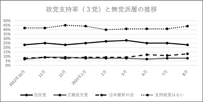 政党支持率は1.自民党23%(前回25%)2.日本維新の会13%(同11%)3.立憲民主党8%(同8%)--という上位の順序が定着した。6月調査からは政党支持と並行して「今、衆議院選挙が行われたら、比例代表でどの政党に投票しますか」と質問しており、こちらは1.自民20%(同21%)2.維新16%(同15%)3.立憲10%(同10%)--と維新が自民に迫る勢いをみせている。