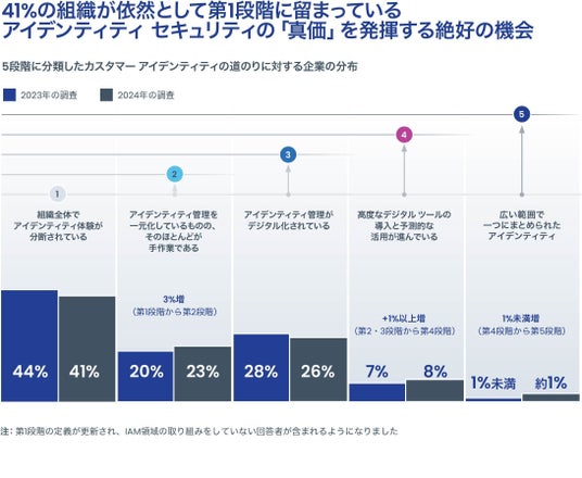 アイデンティティ セキュリティの価値は、現在のところまだ大部分が活用されていません。調査対象組織のうち、約41%はアイデンティティの道のりにおいて初期段階にとどまっており、より高度な段階に進んでいる組織はわずか10%に過ぎません。この顕著な格差は、アイデンティティ セキュリティの潜在的な可能性を最大限に引き出す大きなチャンスが組織にあることを浮き彫りにしています。