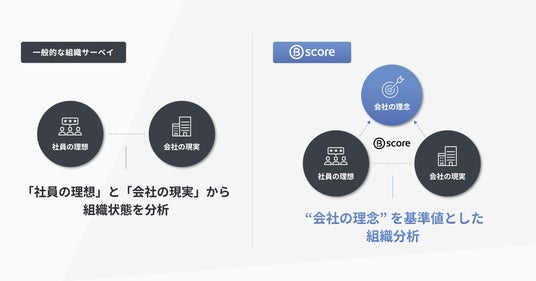 一般的な組織サーベイでは、「社員の理想」と「会社の現実」における差分を計ることで、従業員満足度などの組織状態を分析します。しかし、どれだけ社員の理想を追求したとしても、会社の目指す方向性とズレていると強いブランドはつくれません。そこで、B-SCOREでは“会社の理念”を基準値に設定。そこに向けた社員の共感や行動を計ることで、本質的なブランド力を導き出すことが最大の特徴です。