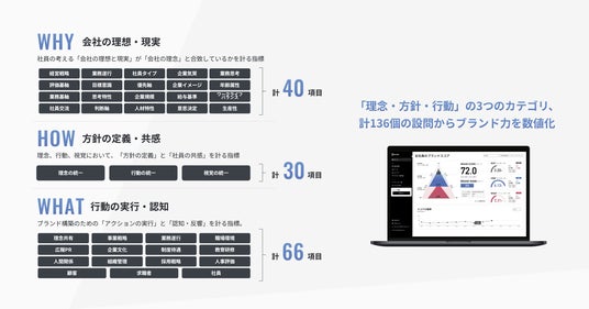 ●「理念・方針・行動」3つのカテゴリ、計136個の設問からブランド力を数値化