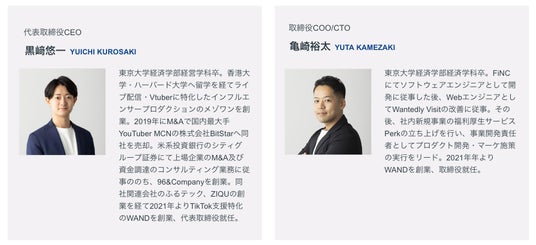 東京大学経済学部卒。香港大学・ハーバ ード大学へ留学を経てライブ配信・ Vtuberに特化したインフルエンサープロ ダクション及び広告代理店のメゾワンを創業。2019年にM&Aで株式会社BitStarへ同社を売却。外資系投資銀行にて上場 企業のM&A及び資金調達のコンサルティング業務に従事ののち、96&Companyを創業。同社関連会社の立ち上げを行った後、2021年よりTikTok支援に特化した WANDを創業、代表取締役就任。取締役COO/CTO 亀崎裕太