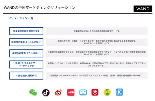 株式会社WAND(ウォンド)は、総フォロワー数1億人以上・4,500人のクリエイターが登録する国内最大級のTikTokを始めとするショート動画クリエイターMCN『LUMOS(ルーモス)』(https://lumos.co.jp/ ;)及び、ショート動画UGC創出を安価に大規模に実現可能な企業向けソリューションならびにインフルエンサー向けのクローズドなマネタイズプラットフォーム『LUMOS BUZZ』を運営するインフルエンサーマーケティング企業です。今回の提携により、WANDを通じた中国向けの越境マーケティングが強化され、アーティストIPの中国進出や現地のSNSマーケティングを包括的に提供することが可能となります。