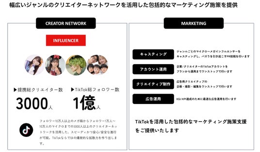 ▼投稿数/FW数保証で自然な口コミ動画をすぐ創出!『まとめてギフティング』▼バズ度で報酬を山分け!成果報酬連動型大量UGC創出の『バズチャレ』▼バズったUGC投稿をクリエイティブに、広告でブースト!『BUZZ CREATIVE AD』▼日本発、世界中でTikTok売れを!『海外キャスティング』▼その他SNSマーケティングサービス(アカウント運用代行/広告運用/Instagram・YouTubeキャスティング/エフェクト制作他)