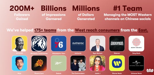 同社はこれまでに、バックストリート・ボーイズ、ジョン・レジェンド、カーリー・レイ・ジェプセン、ブリトニー・スピアーズ、ケイシー・マスグレイヴス、Clairo、ショーン・メンデス、The Chainsmokers、YUNGBLUD、ジェシー・J、Imagine Dragons、トロイ・シヴァン、Omar Apollo、DJ Snake、Nicky Jam、Dillon Francisなど多数の大手音楽アーティストの中国進出を手掛けている他、ウィル・スミスやジェシカ・チャステイン、Cloud9 Esports、ゲイリー・ヴェイナチャックなど、俳優やインフルエンサー、スポーツ団体の中国におけるSNSプロモーションなど、エンターテイメント・IP分野での豊富な実績を保有しています。