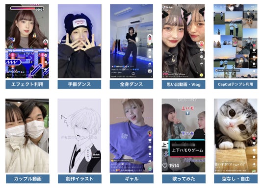 エフェクト利用、手振ダンス、全身ダンス、思い出動画・Vlog、CapCutテンプレ利用、カップル動画、創作イラスト、ギャル、歌ってみた、自由等、業界最多の「10ジャンル以上」からジャンルを選ぶだけで、100本単位でのUGCの創出が可能です。
