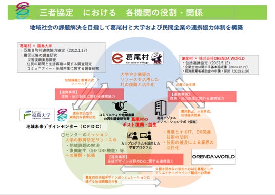 株式会社ORENDA WORLD(本社:東京都港区 代表取締役:澁谷陽史)は、福島大学地域未来デザインセンター(所在地:福島県福島市 センター長:鈴木典夫)および、葛尾村(所在地:福島県葛尾村 村長:篠木弘)と三者連携協定を締結、AIコンピュータと教育システムをはじめとした連携により、福島の未来の一部を担う様々な取り組みを行います。