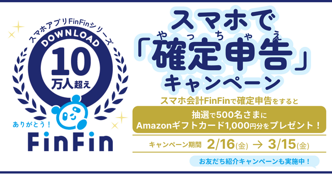 これを記念して、確定申告(やっちゃえ)キャンペーンを開始し、スマホ会計FinFinで確定申告をした方の中から抽選で500名様にAmazonギフトカード1000円分をプレゼントいたします。