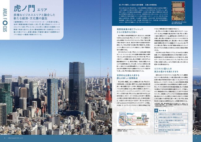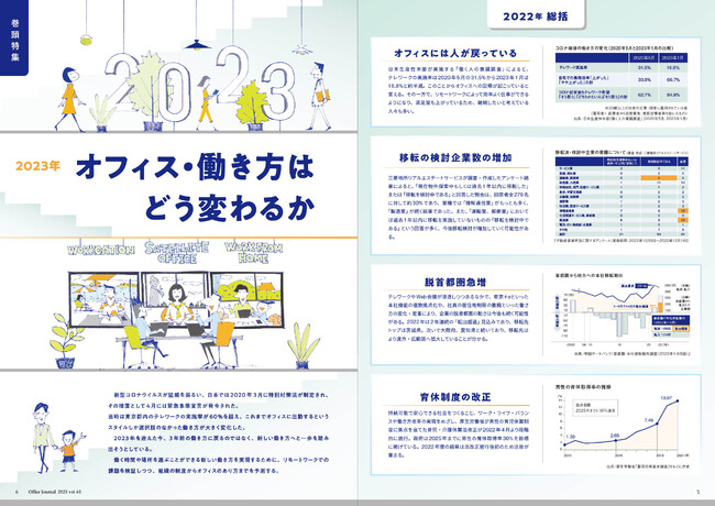 本号では、新型コロナウイルスにより働き方が大きく変化した今、現状の課題と今後のあり方について、リクルートワークス研究所の辰巳哲子氏の解説とともに働く場所をもう一度見つめ直す「2023年 オフィス・働き方はどう変わるか」、話題の再開発事業が各所で竣工し、国際的なビジネス拠点への躍進が期待されている虎ノ門エリアを紹介する「AREA FOCUS 虎ノ門エリア」を特集しています。