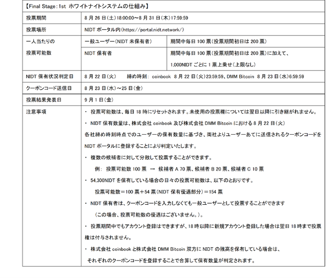 “ホワイトナイトシステム”は、ユーザーが21日OPEN予定のNIDTポータルへのアカウント登録後、投票期間内に候補者を選んで投票できるシステムであり、NIDTを保有していなくても投票することが可能ですが、NIDT保有者はNIDT保有数量により投票可能数が優遇されます。