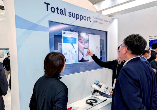 展示台に埋め込まれた液晶モニターに、3DCGで制作した映像が広がる。展示物の周りを花々が彩り、目を惹く演出を制作。4つの液晶モニターは連動しており、同タイミングで花々が咲き、散ってゆく。