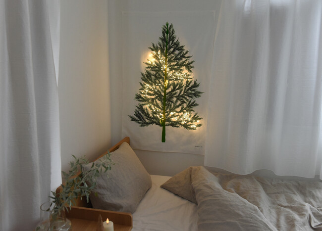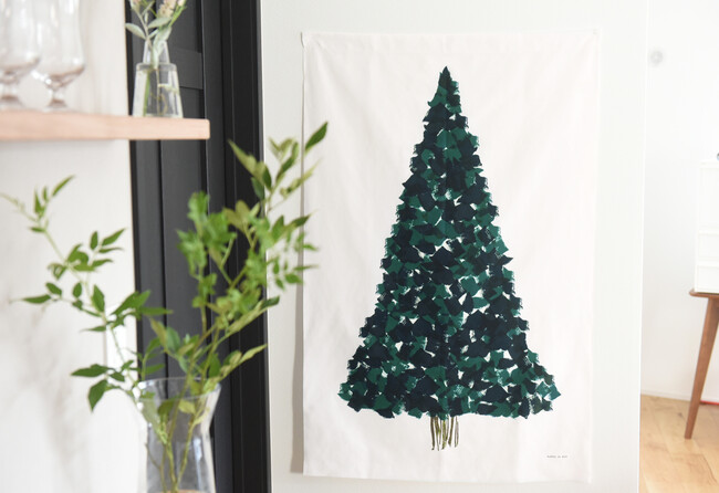 けれど飾り付けや後片付けが大変だし、時期が過ぎてからの保管も場所をとる。そんな懸念なく飾れるのが、壁に貼るタイプの「クリスマスツリータペストリー」です。
