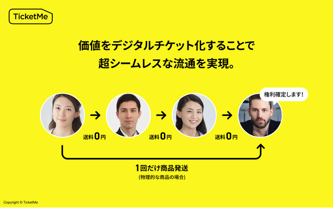 チケミーでは、モノや権利の売買はすべてそれらに紐づいたオンライン上の『チケット』を用いて行われ、受け取りや利用が確定されるまで、実際の商品の配送等はありません。