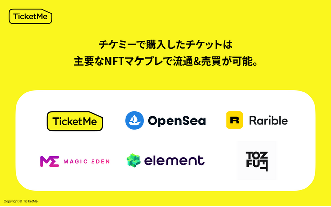 『TicketMe(チケミー)』は以下のようにたくさんのマーケットプレイスと連携をしており、チケミーで出品されたものや権利に紐づく『チケット』は以下のすべてのマーケットプレイスで売買ができます。